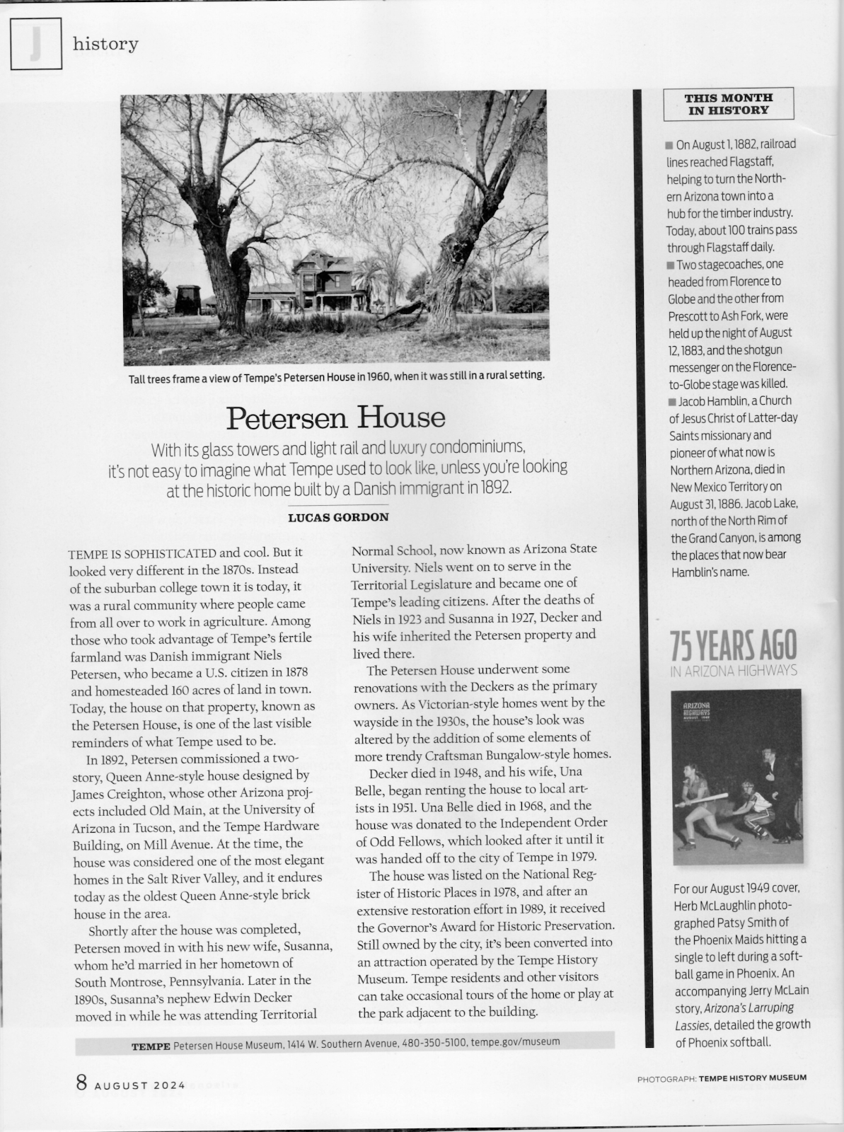 In a recent issue of Arizona Highways magazine, I was astonished to see an article on the "Petersen House" in the town of Tempe, Arizona, USA. The name "Petersen" always grabs my attention, as it is my Best Beloved's birth name and she has many relatives in Denmark. The article tells of a Neils Petersen (a traditional christian name in her family) who settled in Arizona in 1878 and built the house in Tempe in 1892. The house is a two-story Queen Ann style building designed by James Creighton, who also designed part of the University of Arizona at Tucson. Here is the article, with acknowledgement to Arizona Highways Magazine: